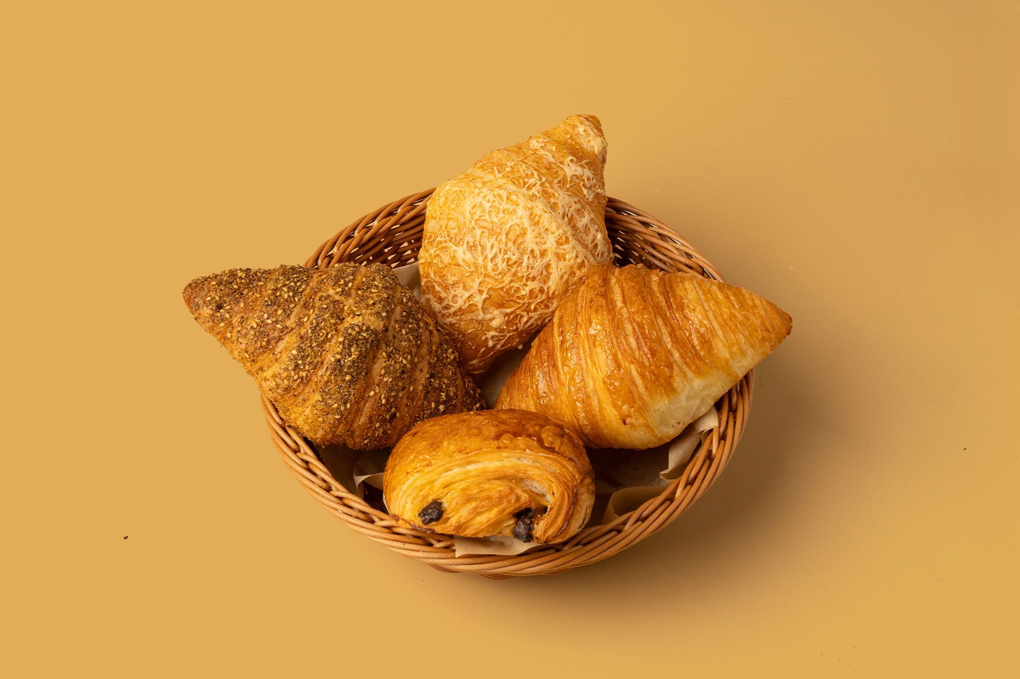 A basket of our freshly baked croissants including butter croissants, cheese croissants, zaatar croissant and chocolate croissant. | سلة من الكرواسون الطازج بما في ذلك كرواسون الزبدة العادي، كرواسون الجبن، كرواسون الزعتر وكرواسون الشوكولاتة