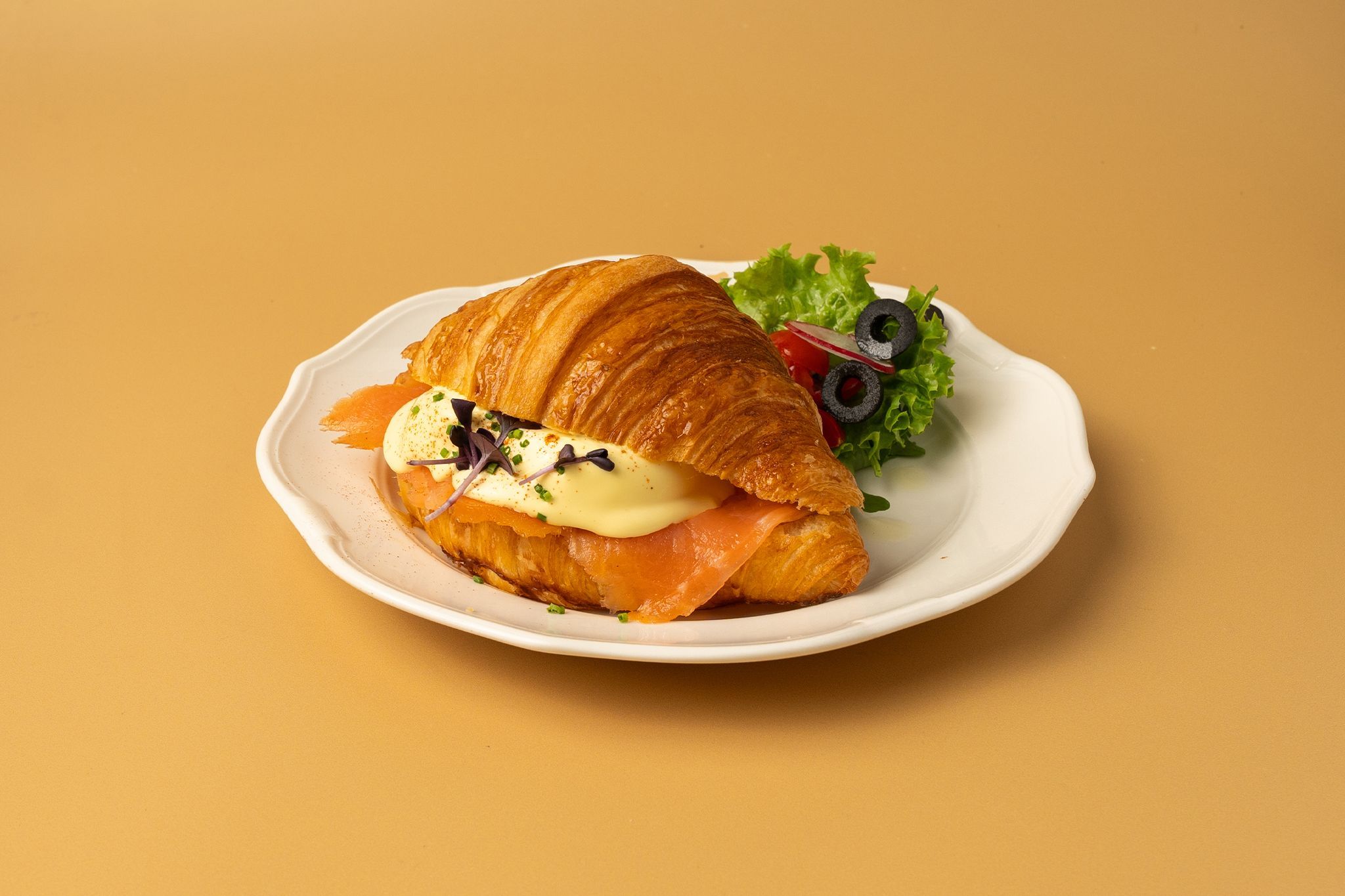 The perfect combination of poached eggs and salmon on our buttery croissant with homemade hollandaise sauce, served with salad on the side. | مزيج مثالي من البيض المسلوق وسمك السلمون على كرواسون بالزبدة مع صلصة هولندية محلية الصنع.