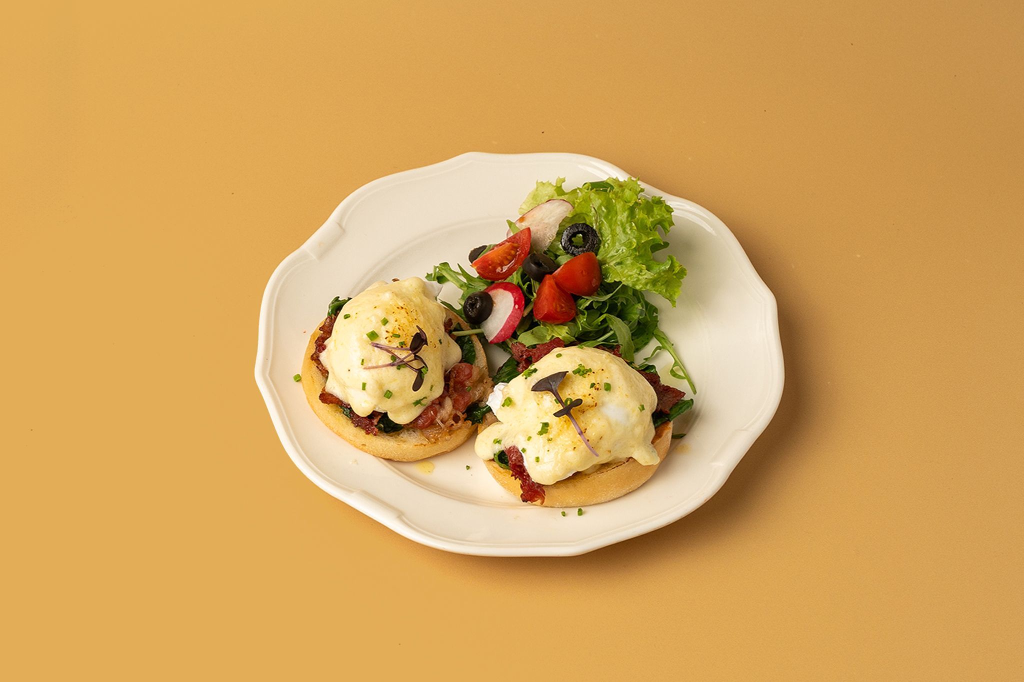 Eggs Florentine made of poached fresh farm eggs., beef bacon, and moranaise sauce on gluten free muffins or butter croissant, served with salad on the side. | بيض فلورنتين بالبيض المسلوق ولحم البقر المقدد وصلصة المورانيز على الكعك الخالي من الجلوتين (كرواسون)