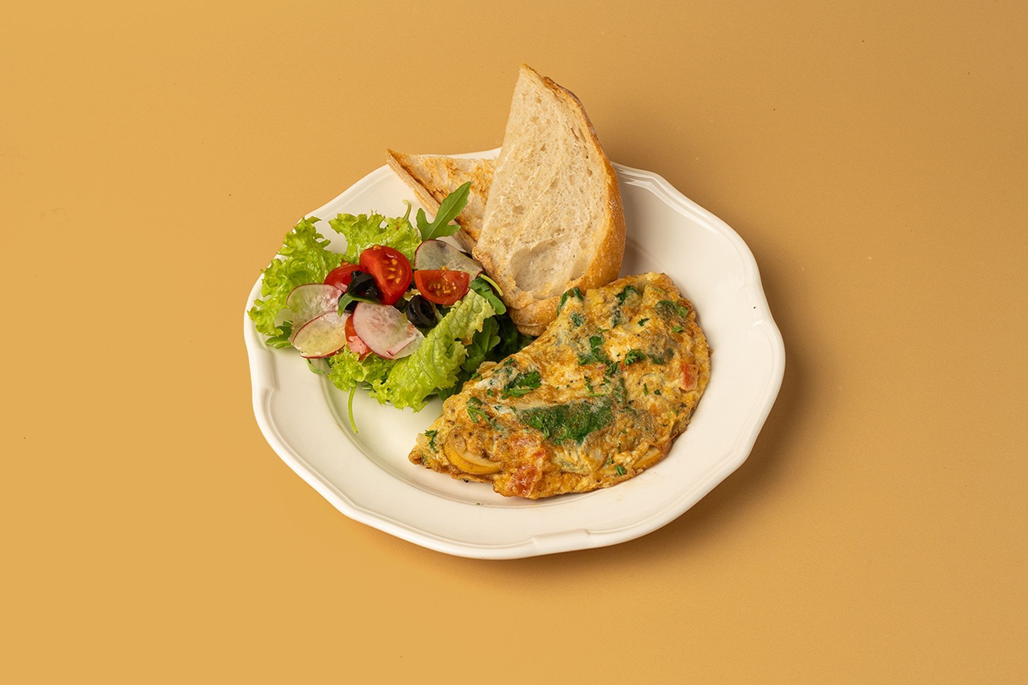 Make your own choice of omelet with a combination of fresh ingredients and fresh farm eggs. [Bell Pepper, Tomatoes, Spinach, Sauteed Mushroom, Cheddar Cheese, Feta Cheese], (+ Veal Bacon / Turkey), served with salad on the side. | "اصنع اختيارك من العجة مع مزيج من المكونات الطازجة : فلفل حلو، طماطم، سبانخ، فطر ، جبنة شيدر، جبنة فيتا. إختيارات الإضافات : لحم العجل المقدد ديك رومي مدخن"