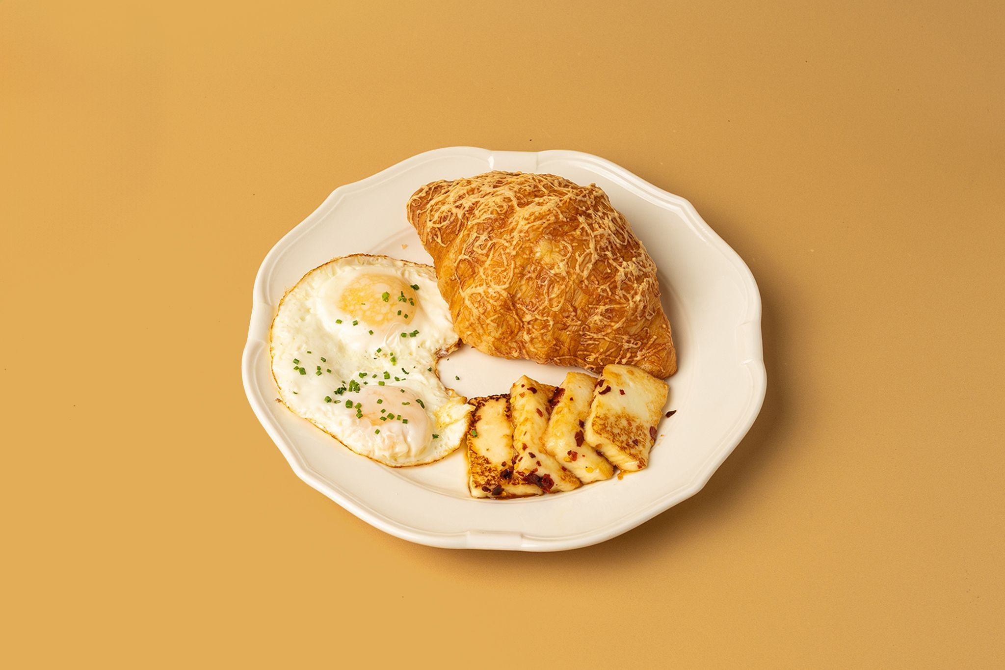 Grilled honey chili seared Halloumi and fresh farm eggs, served with croissant of your choice from our bakery. | جبن حلومي مشوي بالعسل والفلفل الحار وبيض يقدم مع كرواسون من اختيارك من مخبزنا.