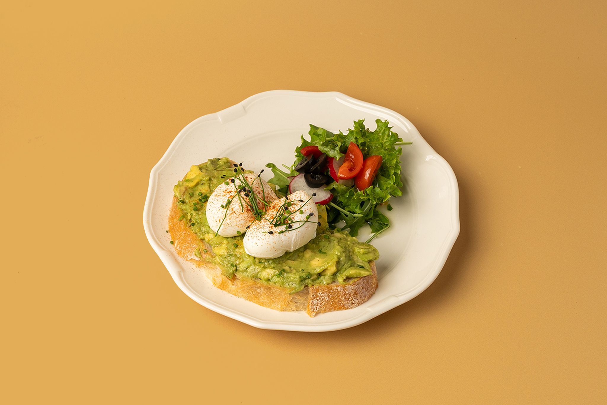 A combination of mashed ripe avocado and Fresh Farm Eggs. on our sour dough bread served with salad on the side. | مزيج من الأفوكادو الناضج المهروس والبيض على خبز العجين الحامض المخمر