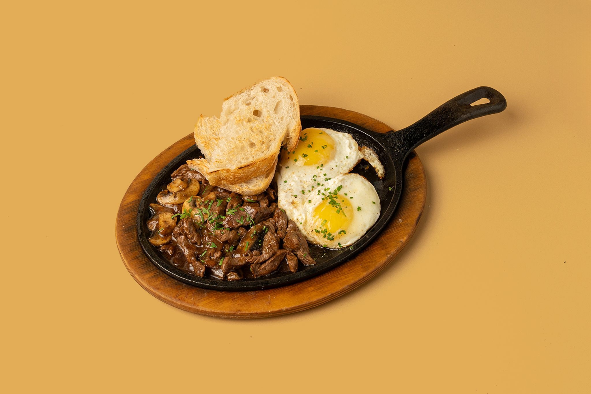 A blend of rich flavors of tender beef, earthy mushrooms, and golden hash brown potatoes along with eggs and slice of bread on the side. | مزيج من النكهات الغنية من لحم البقر الطري، والفطر الترابي، والبطاطس البنية الذهبية مع بيض الدجاج الحر
