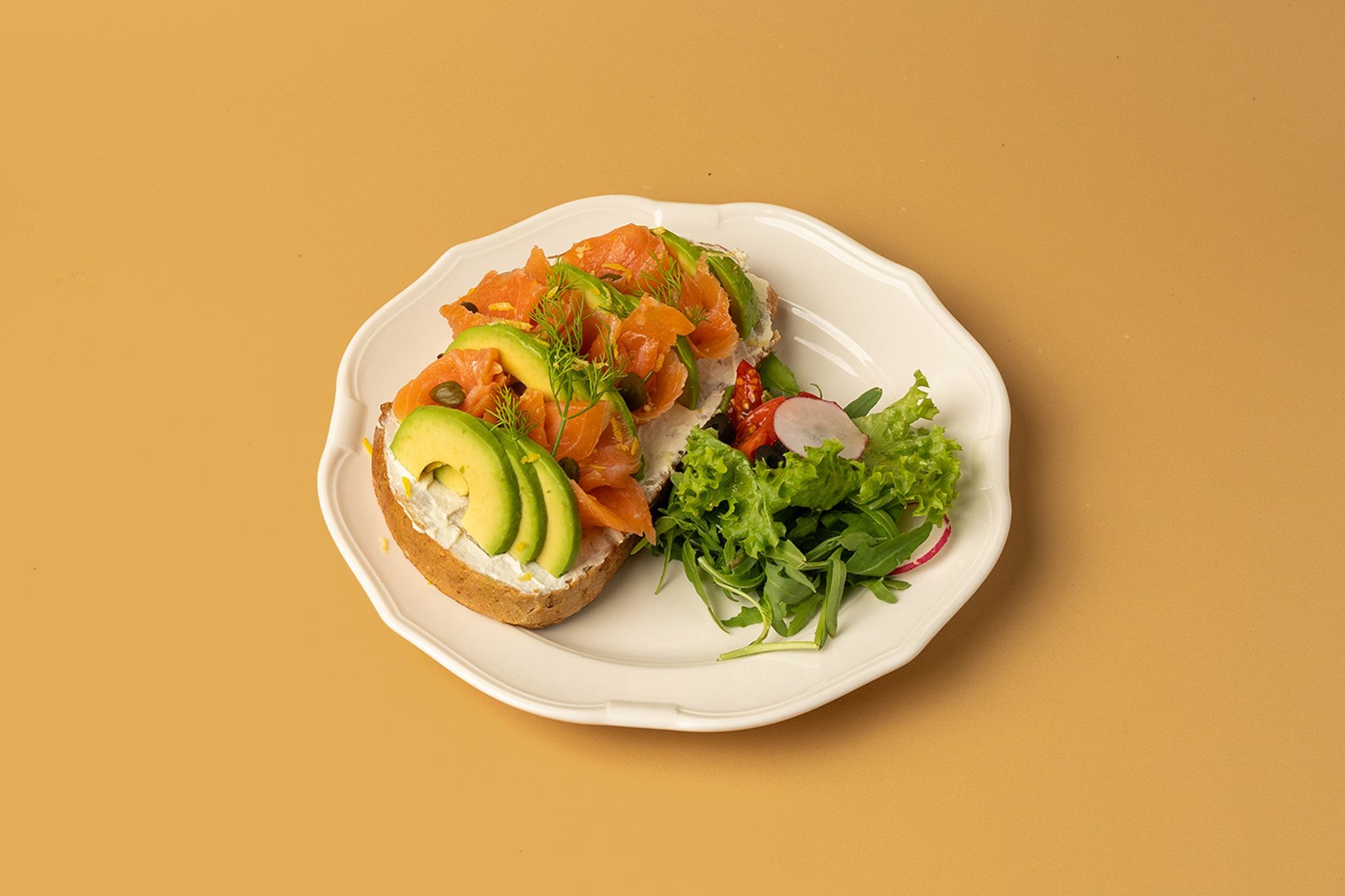 Smoked salmon and avocado medley on our rustic bread. Served with salad on the side. | السلمون المدخن والأفوكادو على خبزنا الريفي.