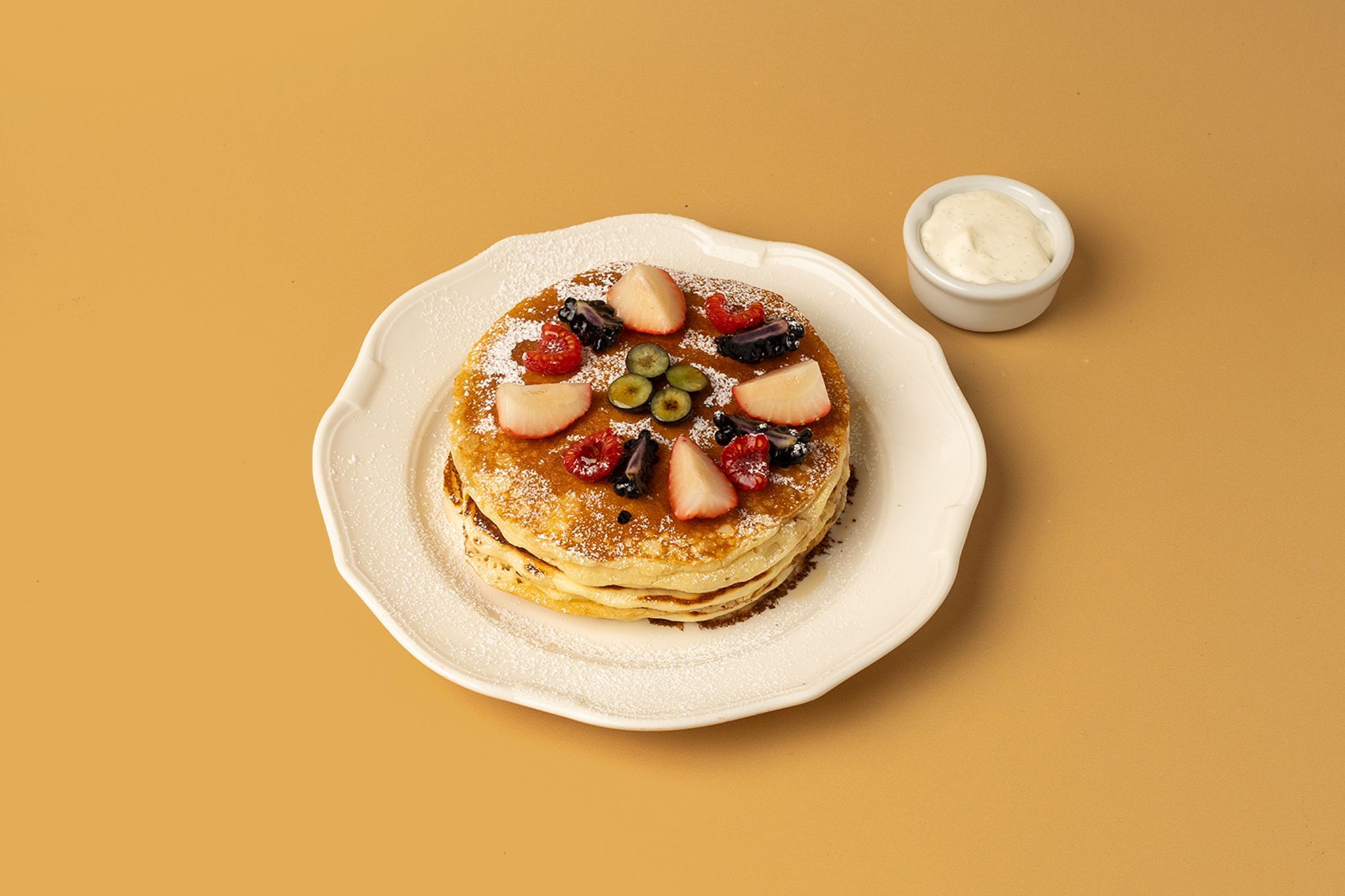 Whipped vanilla, mascarpone mix, Nutella, pancake syrup, selection of fresh berries and fresh banana. | بانكيك مع فواكه طازجة، كريمة الماسكاربون و الفانيليا وشراب القيقب