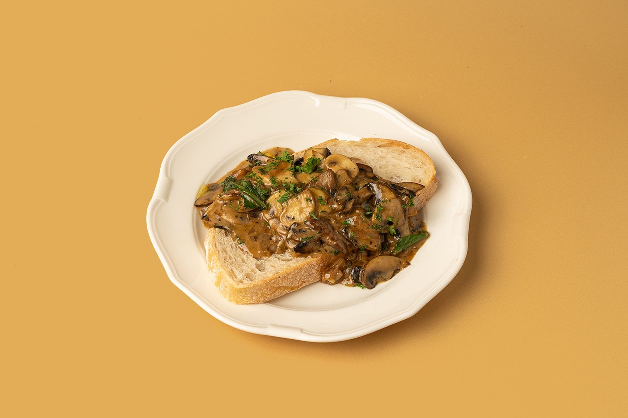 Our classic Mushroom toast with wild mushrooms, cream and spinach on sourdough bread. | "توست الفطر الكلاسيكي بالفطر البري، كريمة وسبانخ على خبز العجين المخمر الحامض"